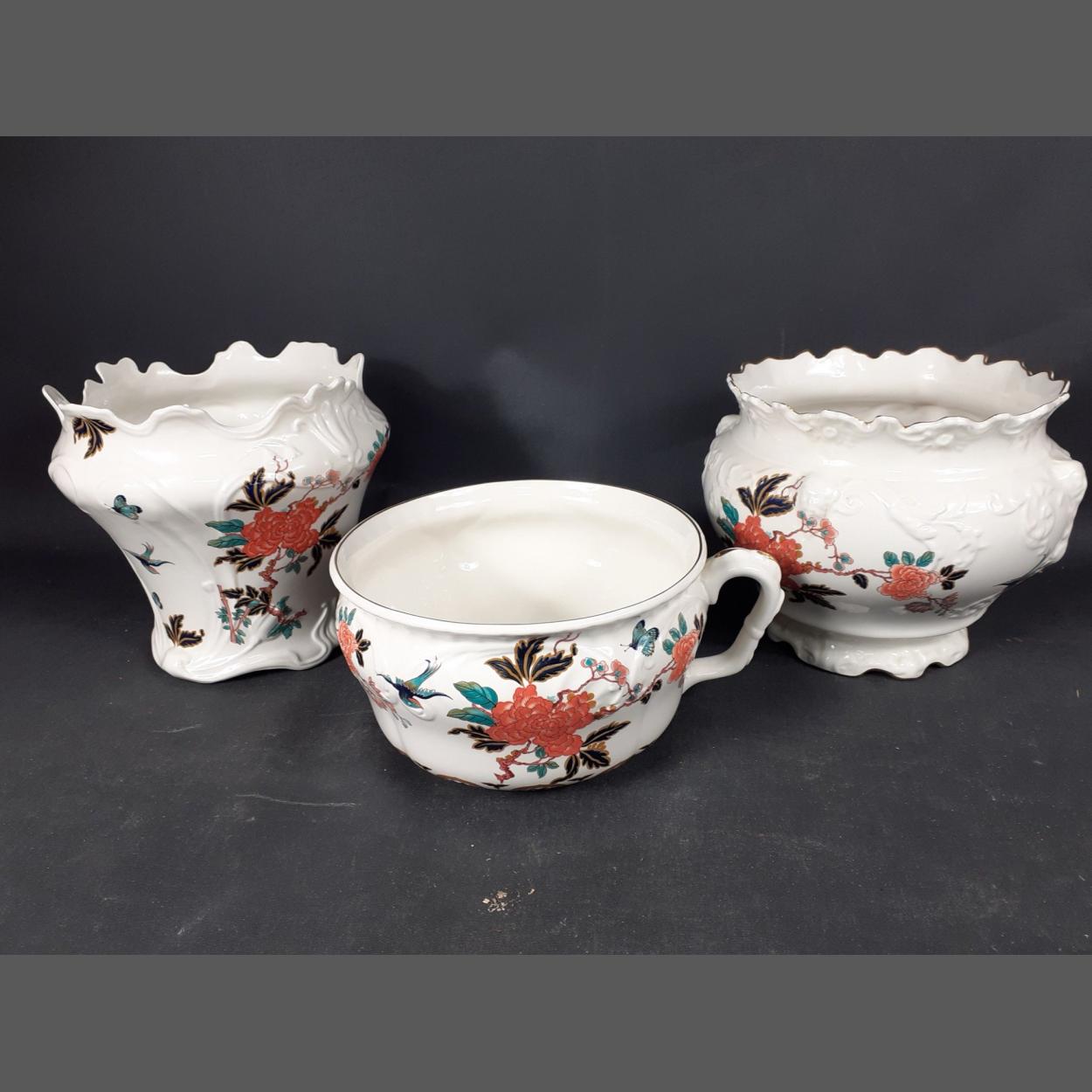 A chamberpot and two jardinieres by JAMES KENT 'Old Foley' ware, chamberpot 22cm dia, jardiniere stamped 'Balmoral' 20cm high, jardiniere stamped 'King 6/6, 21cm high