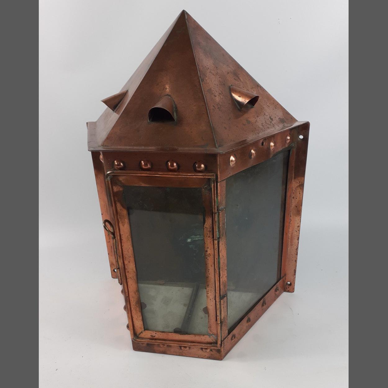 An attractive copper lantern with 3 glass panels which can be either free-standing or wall-mounted, height approx 44cm, width 32cm