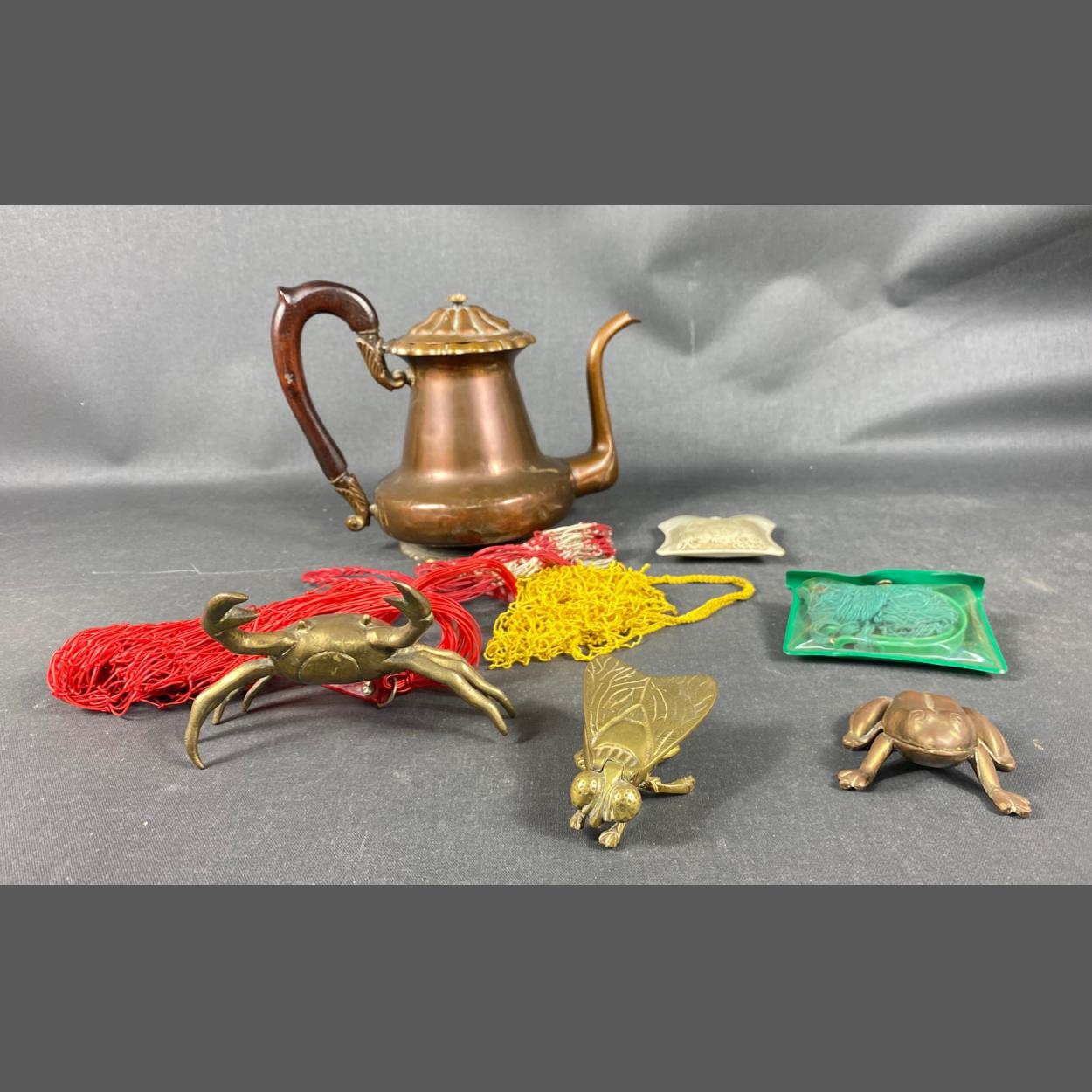 A mixed metal lot to include a brass VESTA MOTH (9cm), a copper teapot (22cm tall), a brass frog (W16cm), a brass frog (8cm L) etc