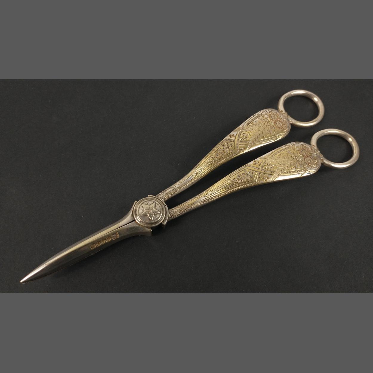 A pair of vintage EPNS grape scissors finely decorated 18cm long