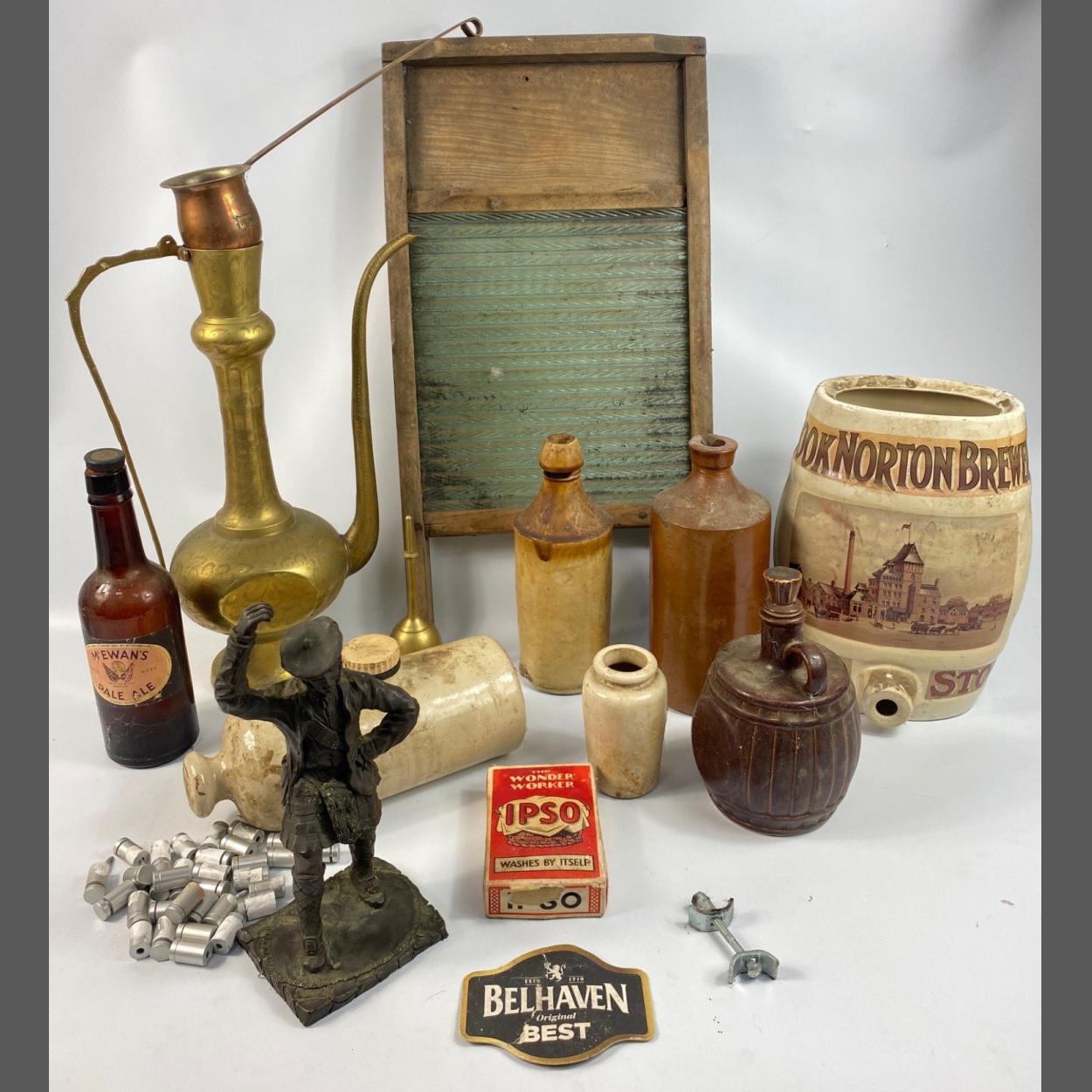 An interesting collection of antique stoneware, cleaning and household items to include glass fronted wash board, Stoneware Ale dispenser with stunning HOOK NORTON BREWERY graphics but without lid or tap, a stone hot water bottle, a spelter model of a Scottish figure and other stoneware items.