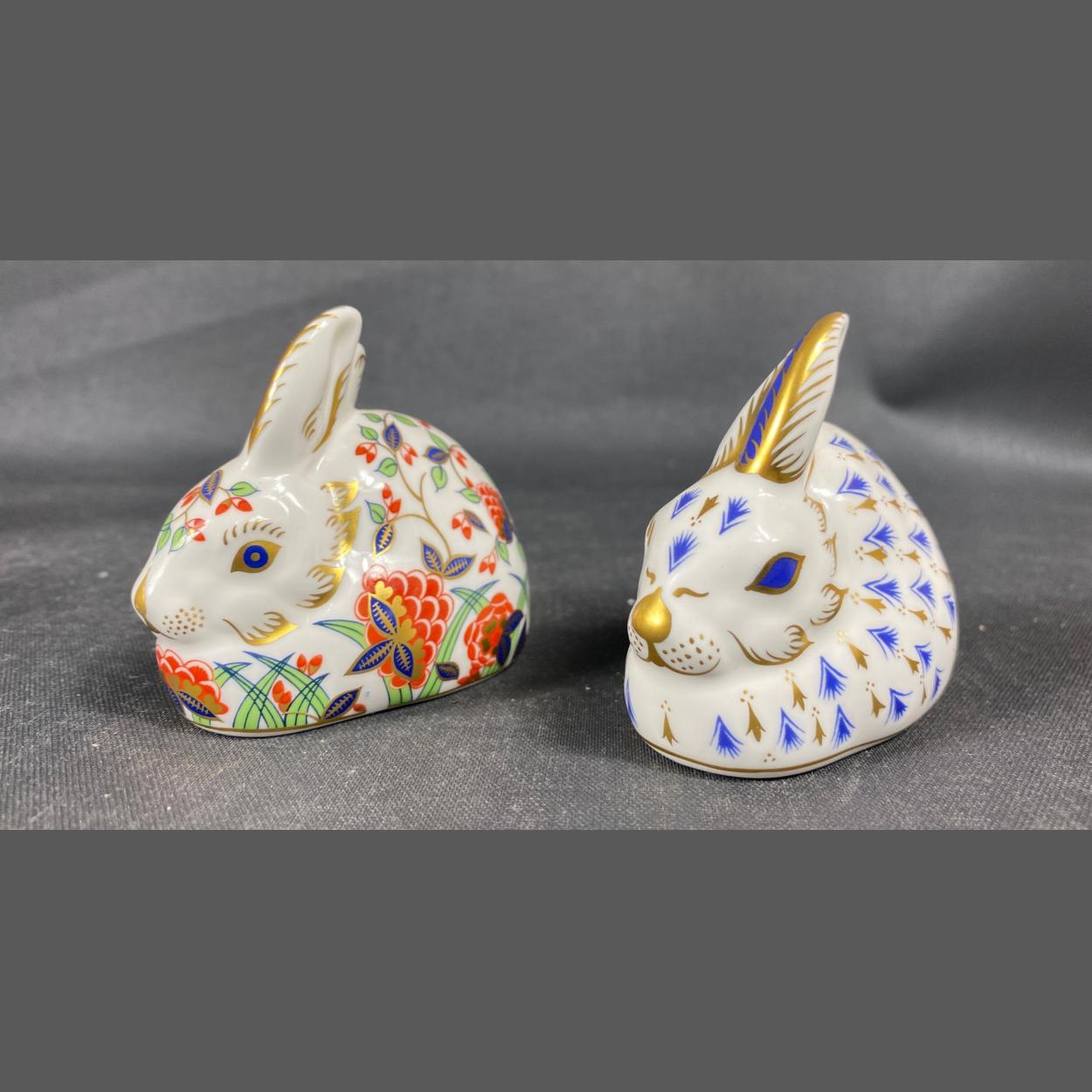 ROYAL CROWN DERBY - two gold button rabbits both approx 8cm long, one labelled MEADOW RABBIT - exclusive for The Royal Crown Derby Collector's Club