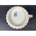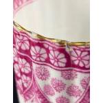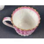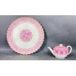 RARE SPODE TEA SERVICE - A Stunning SPODE tea set to include an oval scalloped dish 37cm wide, a tea pot complete with lid, 4 cups, 4 scalloped saucers, a bowl and a cream jug. Vibrant pink decoration throughout each piece along with a great amount of gilding. Condition - a hairline crack runs down the inside of one of the cups and there is a small chip on the outside rim but doesn't detract from the true beauty of this tea set. Also some rubbing to the gilding.