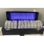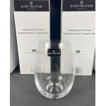 Four boxed pairs of DARTINGTON stemless wine tumblers and a set of twelve crystal glass wine coasters in a fitted box. All in good condition.