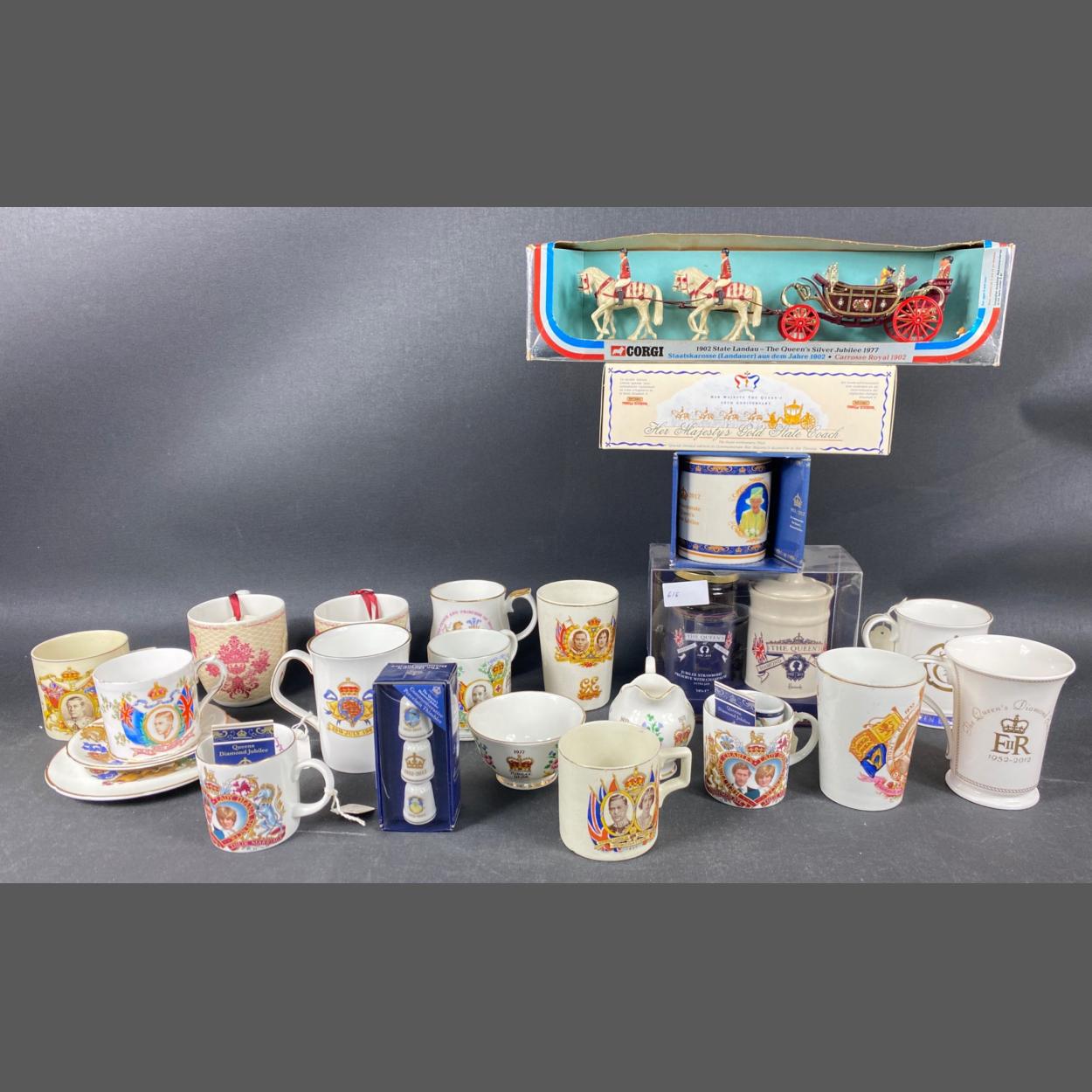 Royal commemorative china to include two ULSTER WEAVERS diamond jubilee mug, 2 Charles & Diana wedding coffee cans, a RINGTONS Charles & Diana mug, a Prince William birth mug, a golden jubilee mug, a DUNOON diamond jubilee mug, a Queen Victoria diamond jubilee beaker, a George Vl coronation beaker, a coronation saucer and plate, a George V silver jubilee mug, a diamond jubilee mug and 3 collectible porcelain mugs (miniature 3cm high), a boxed set of 3 thimbles plus a HARRODS diamond jubilee gift set of strawberry jam and jampot and a boxed CORGI 1902 state landau celebrating The Queen's Silver Jubilee 1977 with coach and horses etc etc. NB. Strawberry Jam carries a 'Best Before' date of December 2014.
