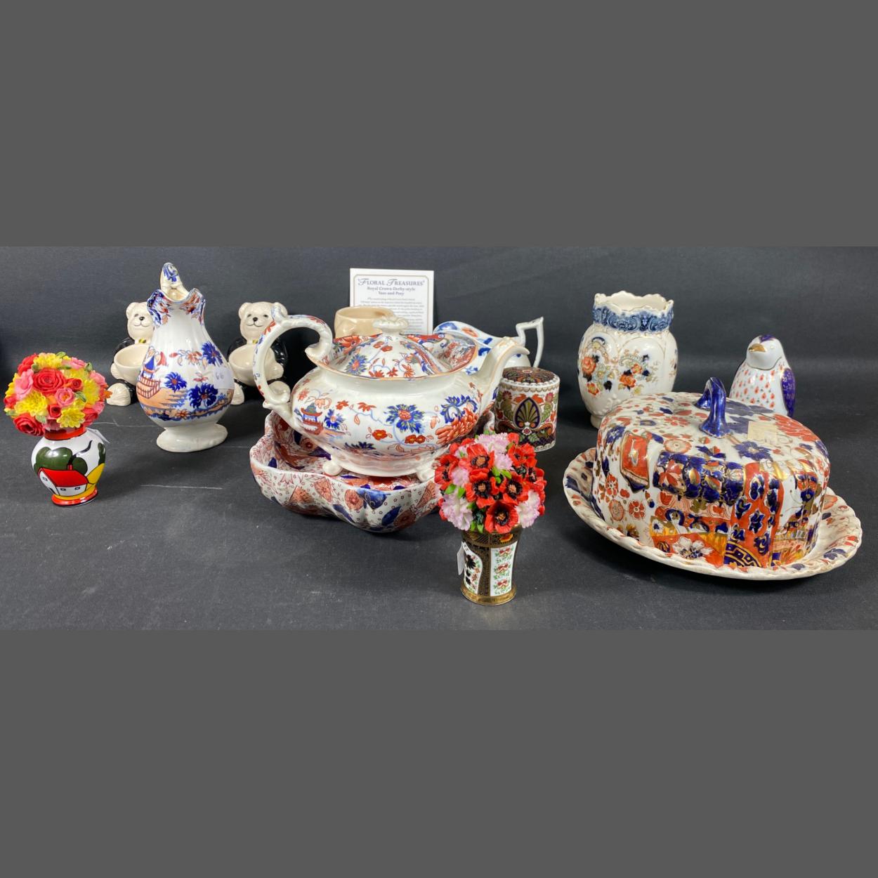 A mixed china collection(some Victorian) to include a SPODE paperweight (7cm high), an AMHERST teapot (approx 17cm high), two ATLAS EDITIONS posy vases (12cm high), 2 RINGTONS teddy bear egg cups, a RINGTONS bunny mug (11cm), an EMPEROR PENGUIN (13cm), etc