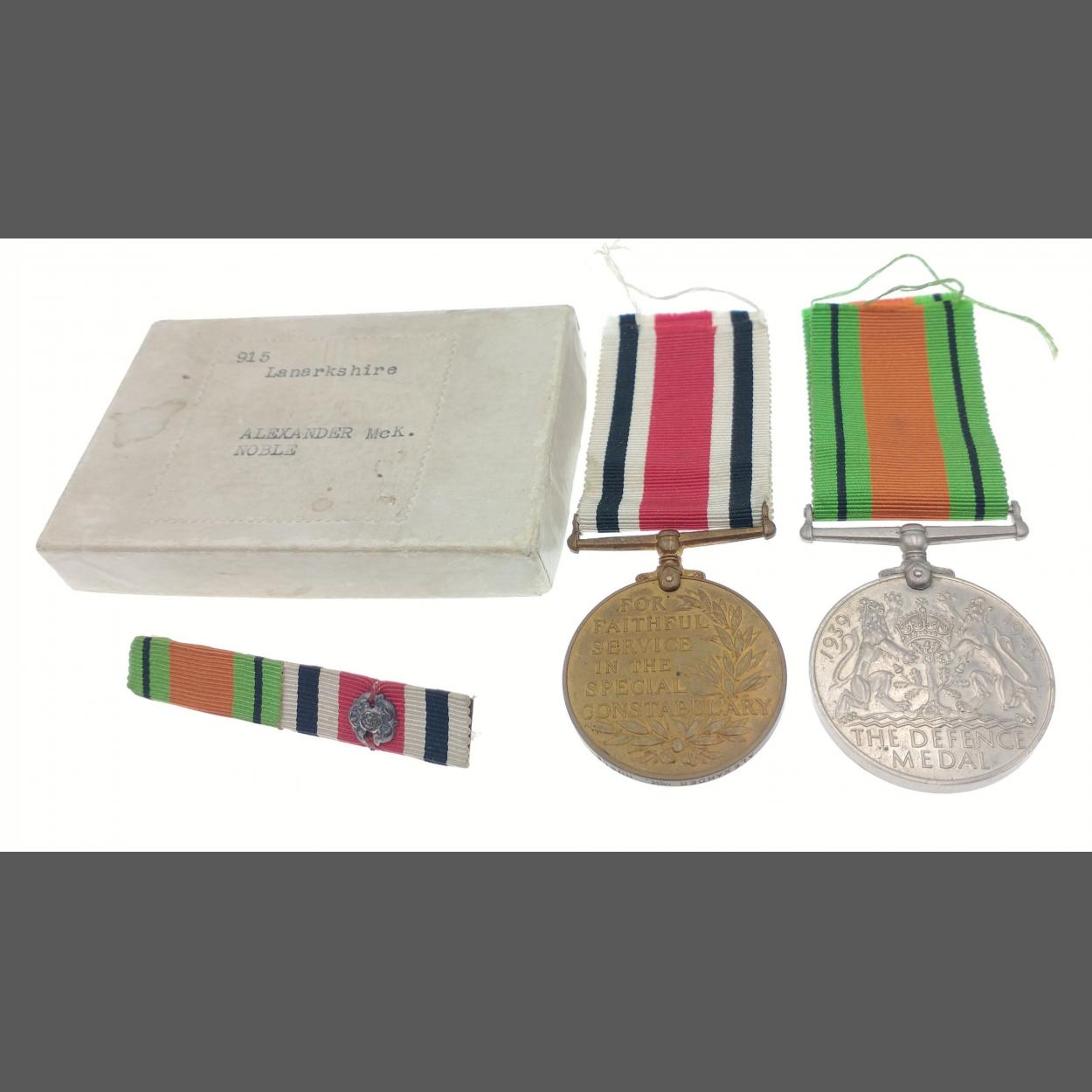 Two WWll service medals for Faithful Service In The Special Constabulary belonging to Alexander McK Noble with ribbon intact, also a DEFENCE Medal 1939-45 for the same recipient complete with ribbon and a bar strip depicting both medal ribbons(missing it's pin)