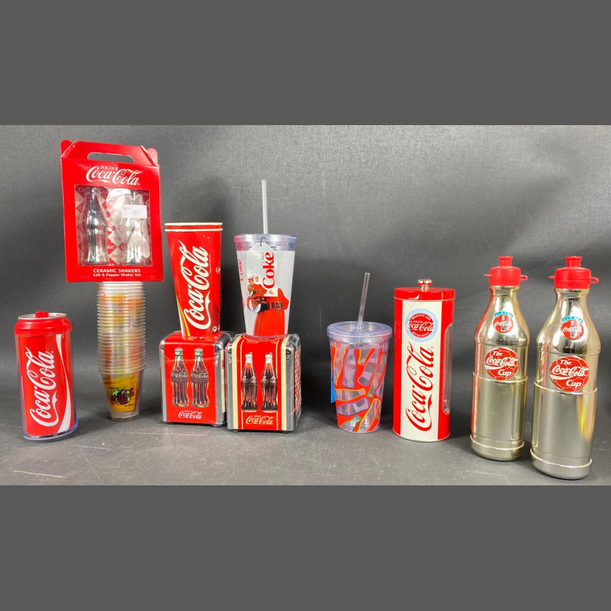 A large selection of COCA-COLA memorabilia to include 2 water bottles, a double-walled drinks can, a ceramic salt and pepper shaker set, plastic cups, drinking straws and 2 serviette dispensers,