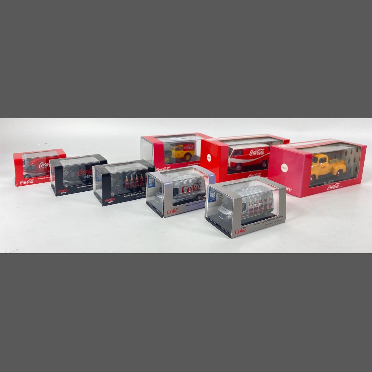 A selection of 8 boxed as new COCA-COLA die cast models to include a Ford F1 pick-up, a VW T3 transporter, an Austin 7 van, and 5 Ford transit vans