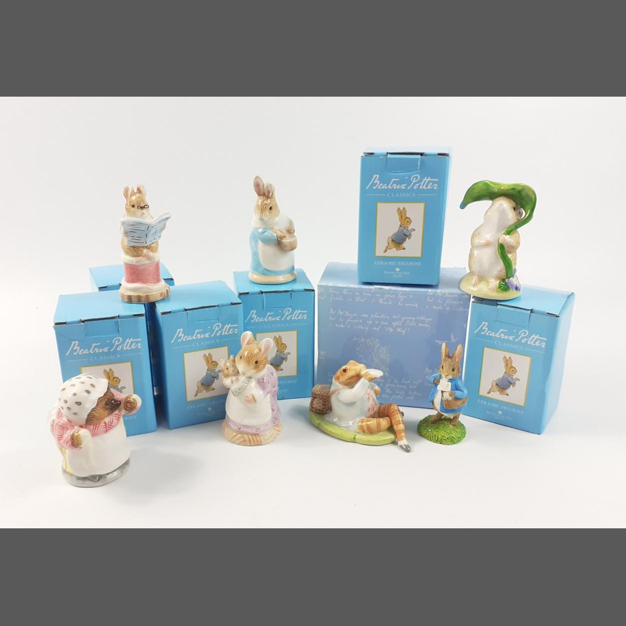 Seven boxed Border Fine Arts characters from BEATRIX POTTER to include the Tailor of Gloucester, Mrs Tiggywinkle, Jeremy Fisher, Timmy Underleaf, Mrs Rabbit, Postman Peter, and Hunca Munca