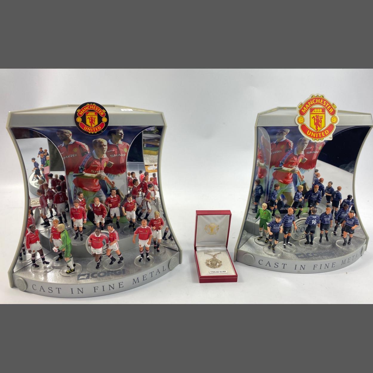 CORGI COLLECTIBLE ICON Manchester United figures and stand including Roy Keane, Nicky Butt, Paul Scholes, Dwight Yorke, Jaap Stam etc in both home and (1999) away strips and a Manchester United pendant (3cm) and chain 60cm long (approx)