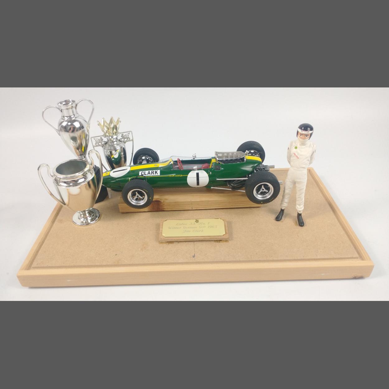 SPARK LOTUS 33 No. 1 Winner German Grand Prix 1965 JIM CLARK. Diorama with cups and standing figure in home built display case.