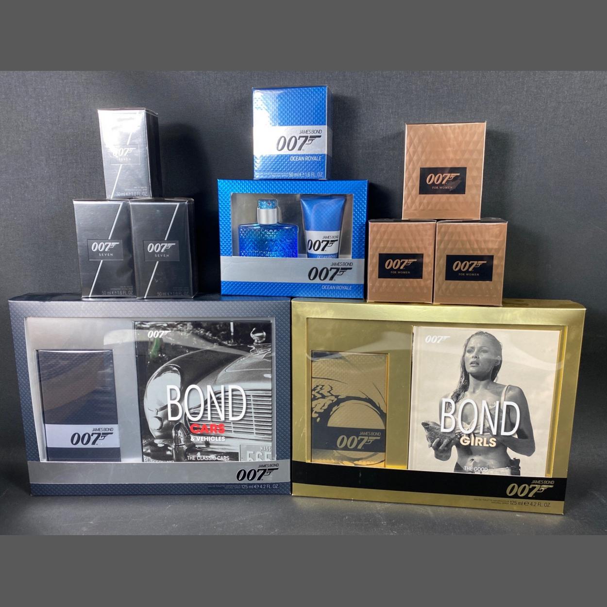 Eau de 007 - all sealed as new JAMES BOND scents to include 2 bottles of 007 FOR WOMEN 30ml, 1 of 50ml; 1 bottle of 007 SEVEN eau de toilette 30ml and 1 of 50ml, 1 bottle after shave 50ml; OCEAN ROYALE eau de toilette 50ml, and a gift set with eau de toilette and shower gel and a gift set of Bond Girls and a James Bond 007 Gold Limited Edition 125ml eau de toilette and a gift set of Bond Cars & Vehicles and a 125ml bottle of James Bond eau du parfum