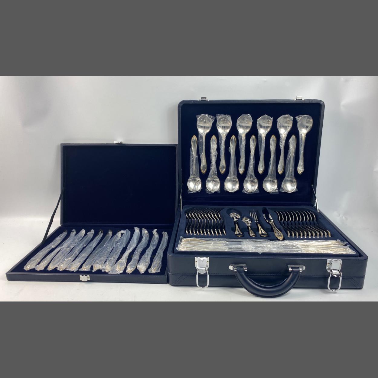 SUISSINE Cutlery set. Beautiful unused, vintage Suissine set in 18/10 mirror polished stainless steel with 22k gold-plated embossed highlight presented in artificial leather cases. Handles are stamped Suissine 18/10 (18 percent chromium and 10 percent is nickel). The brief case contains 12 steak knives, 12 teaspoons, 12 cake forks, 2 serving spoons, 1 cake server, 2 fruit/vegetable serving spoons, 1 soup ladle, 1 gravy ladle, 1 pair of sugar tongs, 2 deli forks, 1 small serving spoon, 12 dinner knives, 12 dinner forks, 12 dinner spoons. Also included is a separate case of 12 additional knives.
