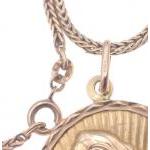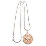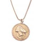 A 18ct yellow gold square chain with 750 stamped yellow gold circular pendant with Egyptian design 2.5cm diameter, chain 60cm long, weight 22.54g, clasp marked 9ct