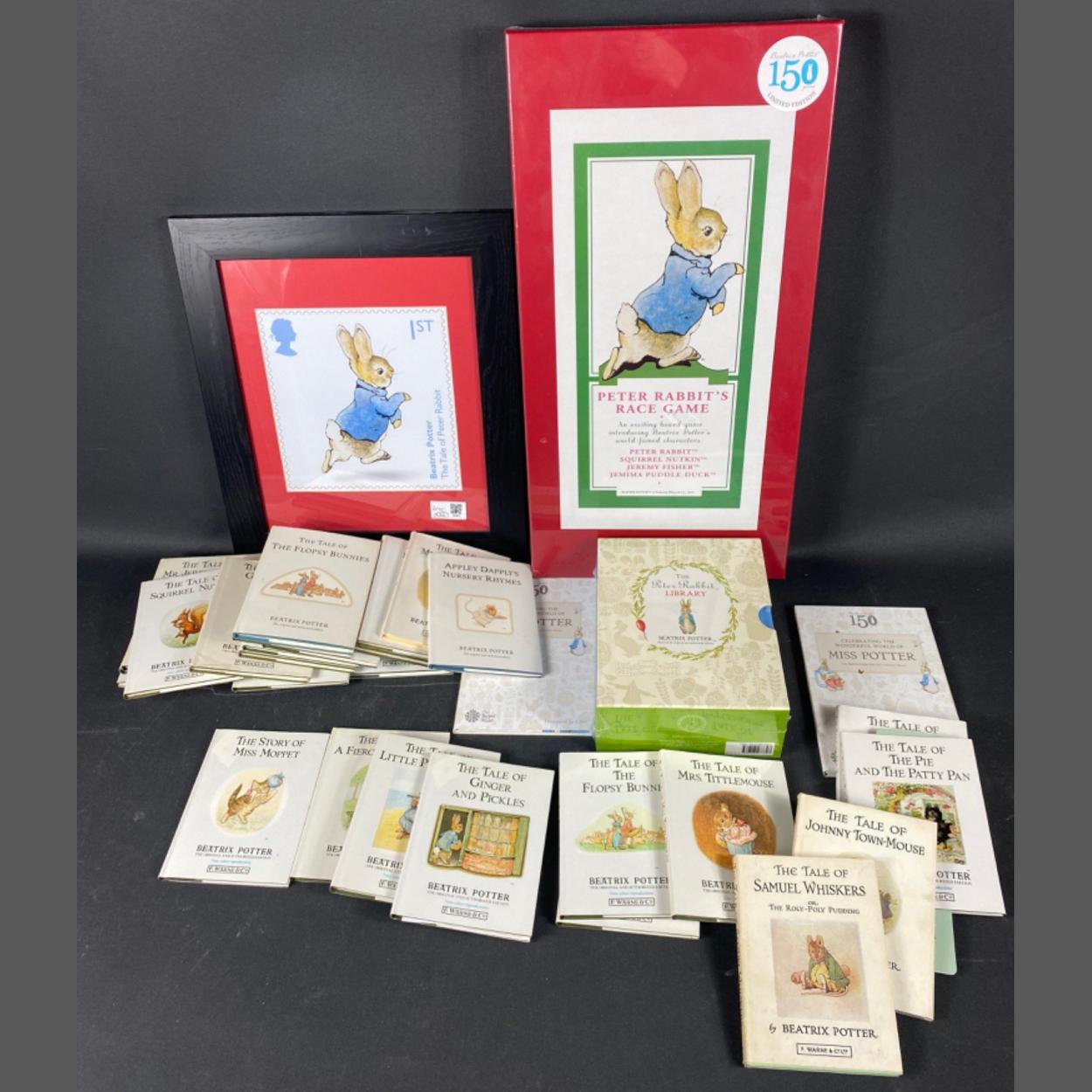BEATRIX POTTER - a sealed limited edition Peter Rabbit's Racing Game, 20 Beatrix Potter stories mainly from 1989, two collectors 50p coin albums "Celebrating the Wonderful World of Miss Potter" 150th Anniversary one comprising coloured images, a sealed set of ten Beatrix Potter stories in a slipcase, a bronzed figure of Peter Rabbit on a wooden plinth (21cm high), a framed print of the Peter Rabbit 1st class stamp (frame size 37x32cm