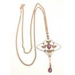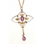 A vintage 9ct stamped amethyst and seed pearl pendant suspended from a 375 stamped yellow gold chain, 42 cm long, pendant 4x3cm gross weight 5.96g