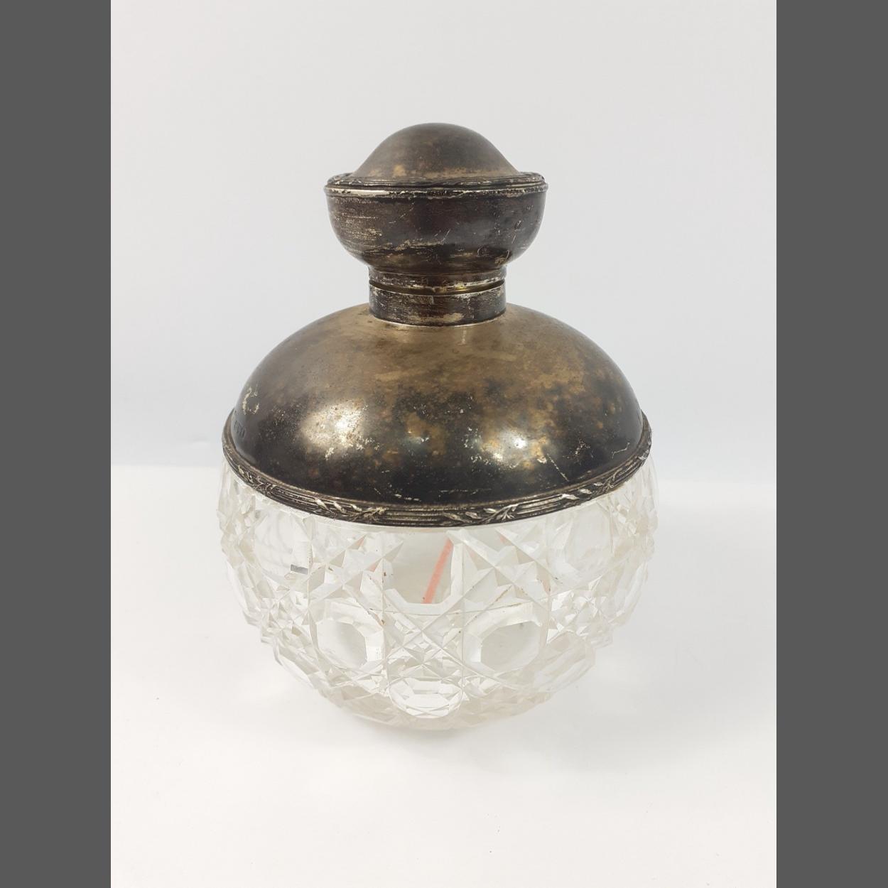 A large cut glass perfume bottle with glass stopper and silver hallmarked top, Chester 1912, stands approx 14cm tall