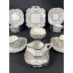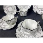 A FABULOUS, complete SHELLEY porcelain tea set in the scarce Queen Anne Black Garland pattern. Consists of 6 cups, 6cm high, a milk jug, 9cm high, a sandwich plate, 24cm long, a sugar bowl, 9.5cm tall, 6 saucers, 13cm long and 6 plates, 6cm long. Condition - Good condition. The odd stain but overall, in good, attractive condition.