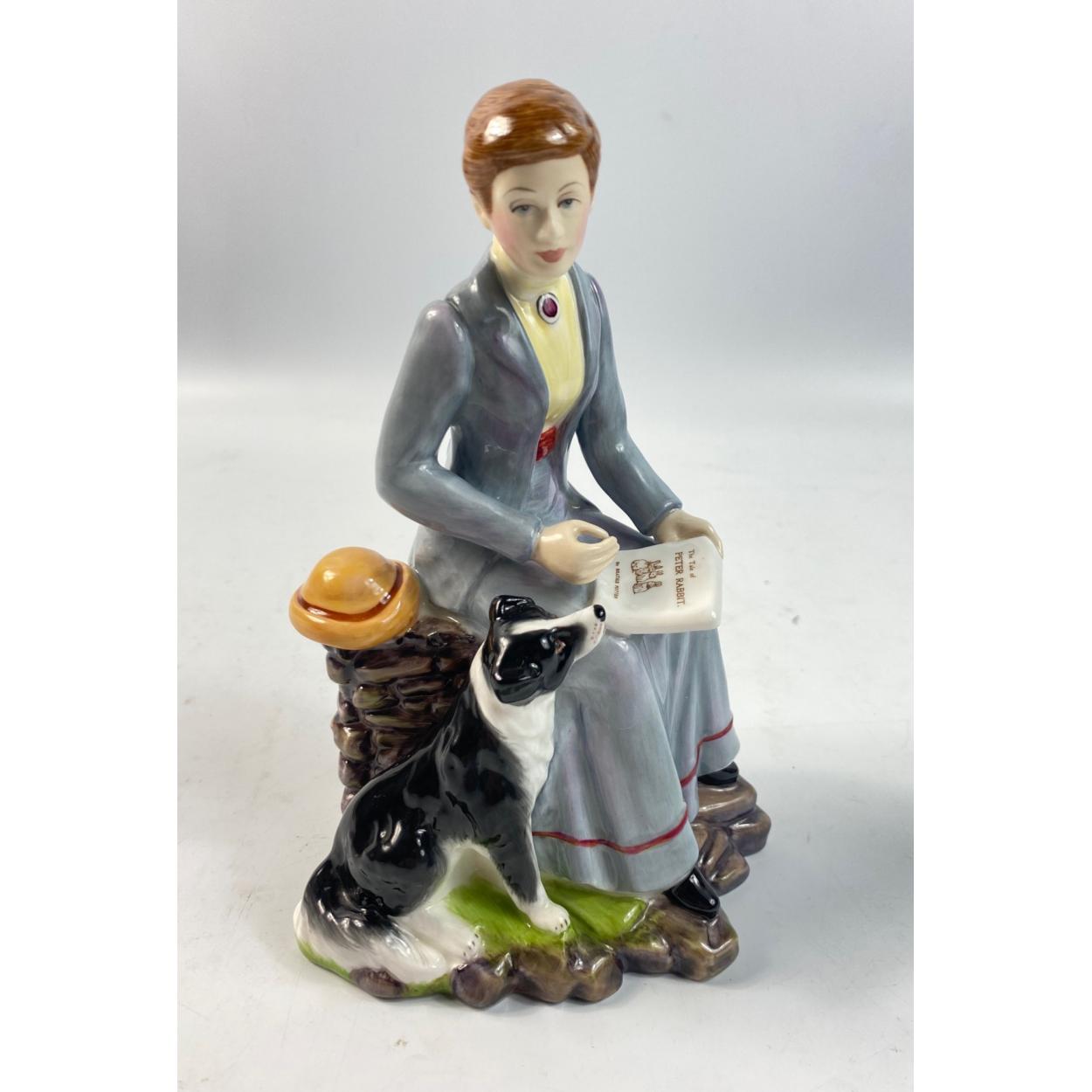 A SCARCE Rockingham china figure "Beatrix Potter" with dog while writing The Tale Of Peter Rabbit. Limited edition No 353 of 750. Item in good condition with no chips, cracks or any signs of damage repair - dimensions 19cm height x 12cm width of base approx