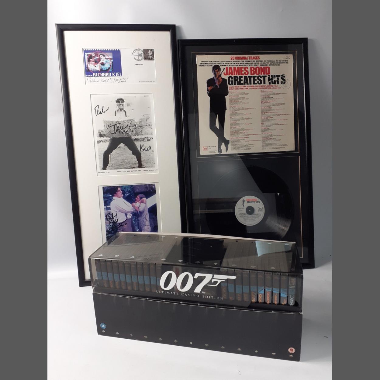JAMES BOND memorabilia to include framed 3 RICHARD KIEL autographs on a first day cover on May 18 2001, a 1978 publicity shot from The Spy Who Loved Me, and also a publicity shot from Moonraker with ROGER MOORE, frame size 81cmx35.5cm, plus a framed JAMES BOND GREATEST HITS showing the cover and LP, frame size 77cmx42.5cm and a boxed 007 Ultimate Casino edition of 22 James Bond DVDs and container (perspex cracked) with unopened playing cards and casino chips (48cmx15cmx21cm)