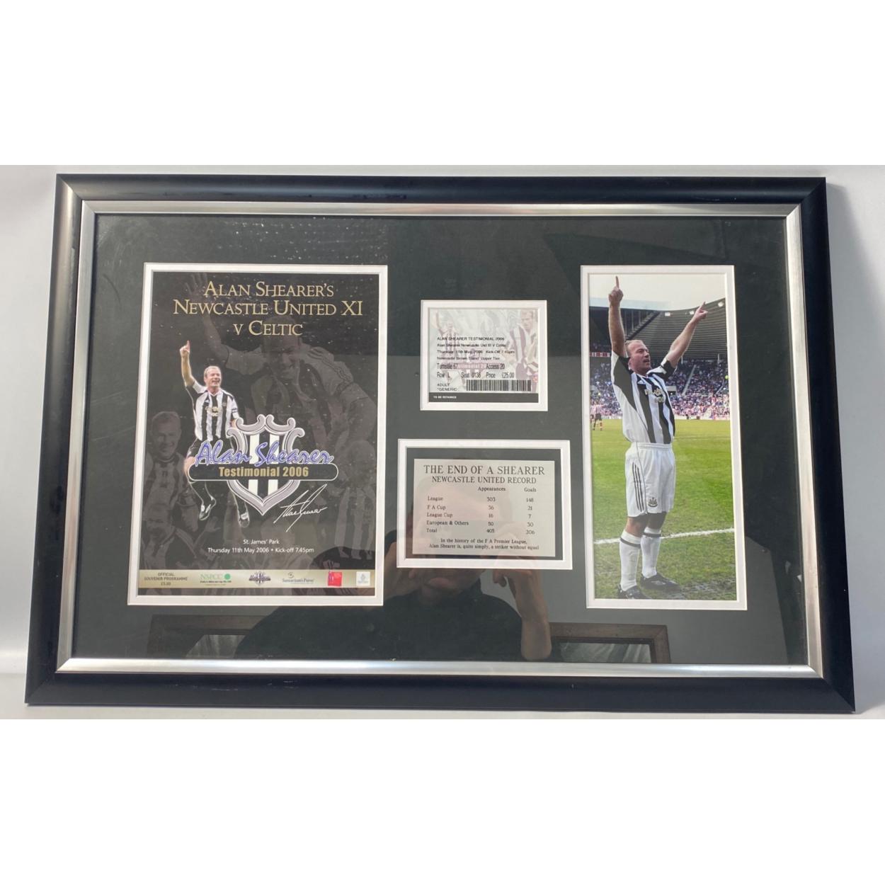 Framed compilation of ALAN SHEARER 2006 11th May testimonial Newcastle United 11 vs Celtic, official programme, photo, and ticket and the end of A Shearer Newcastle United record plaque frame size 69x47cm