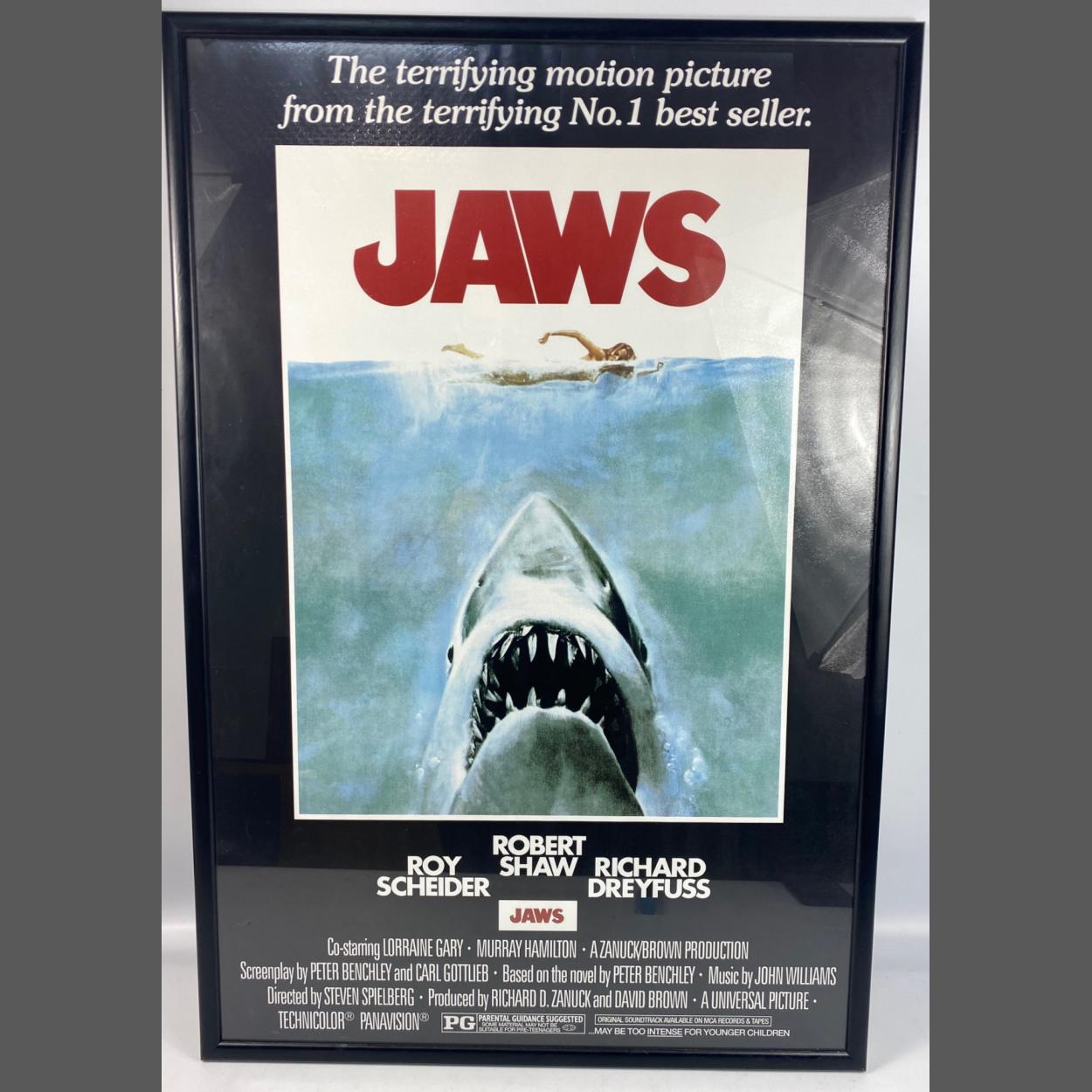 A framed iconic JAWS advertising poster frame size 92x60cm