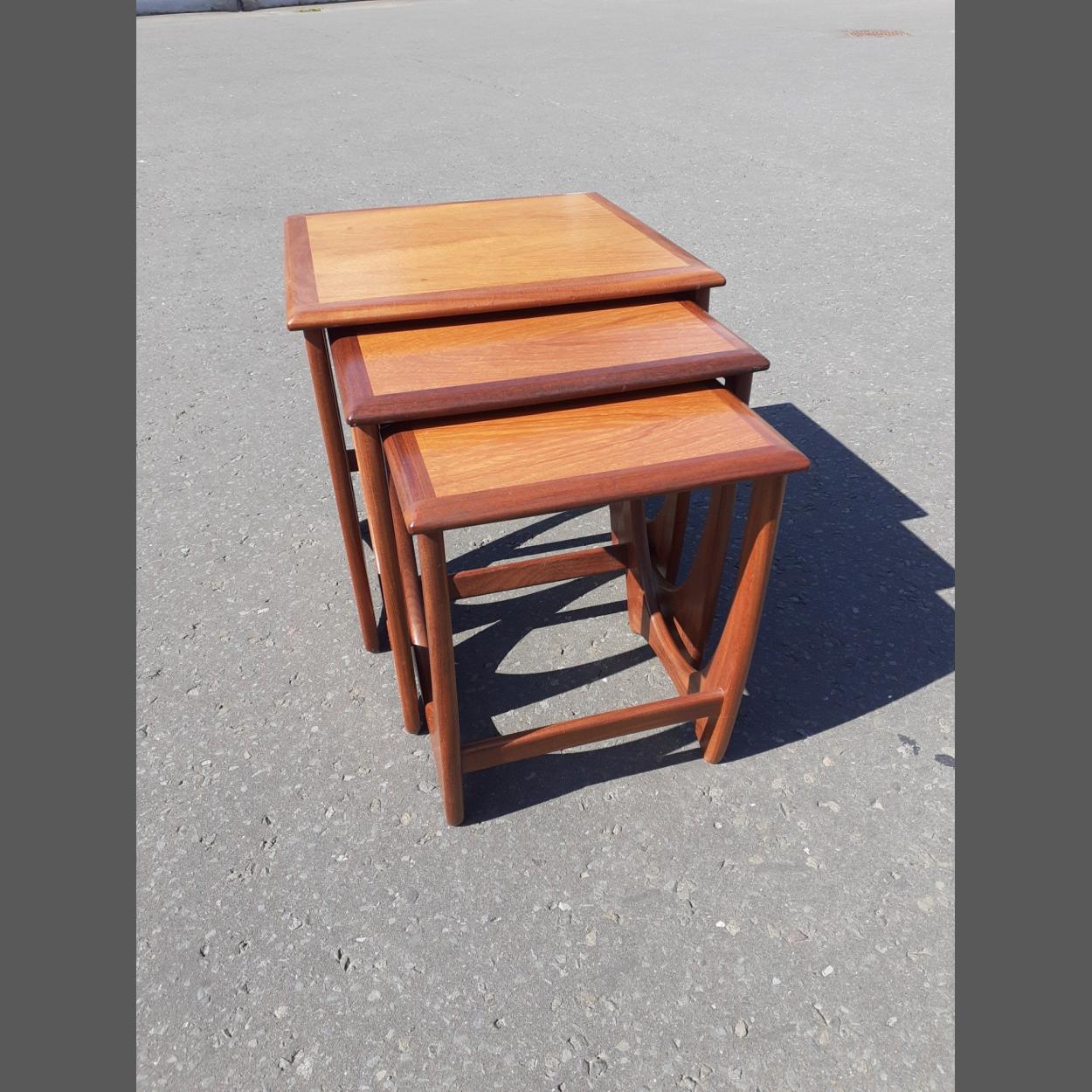 A RETRO set of three G-PLAN teak nest of tables - all in good condition - dimensions 19.5” square top largest table x 20” height aporox