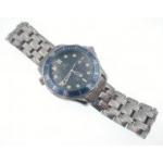 An OMEGA SEAMASTER QUARTZ watch No 90298037 gents wristwatch with blue dial and stainless steel bracelet with original box and International Warranty certificate cards - purchased in 14/02/2008 in Robinsons Jewellers' Altringham - in good overall condition and not worn much, just for special occasions - the clip of the strap has an acceptable amount of wear and still in good condition. Movement was working at time of viewing