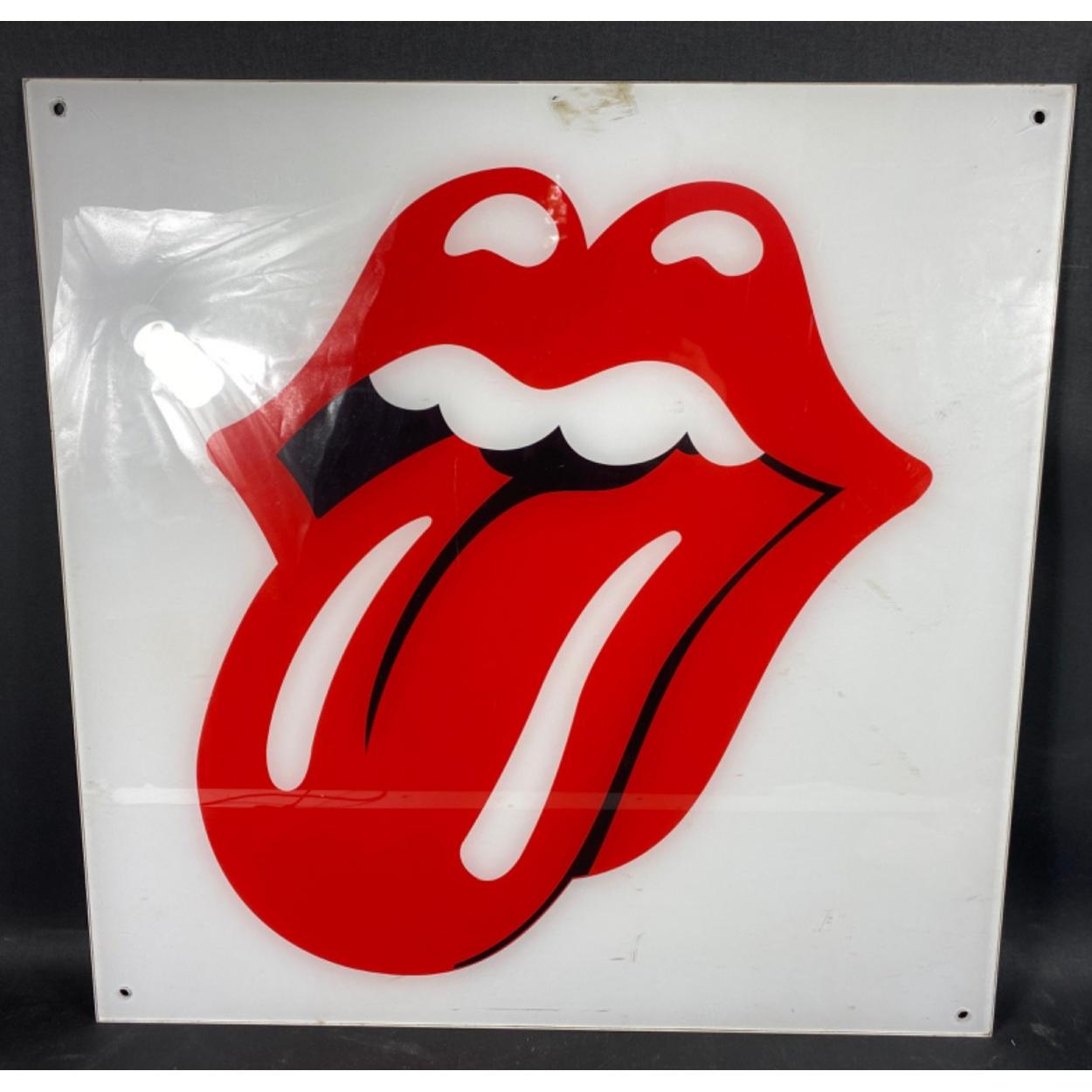 An iconic image - a Perspex enlargement of the ROLLING STONES bright red tongue/lips logo measures 75x75cm
