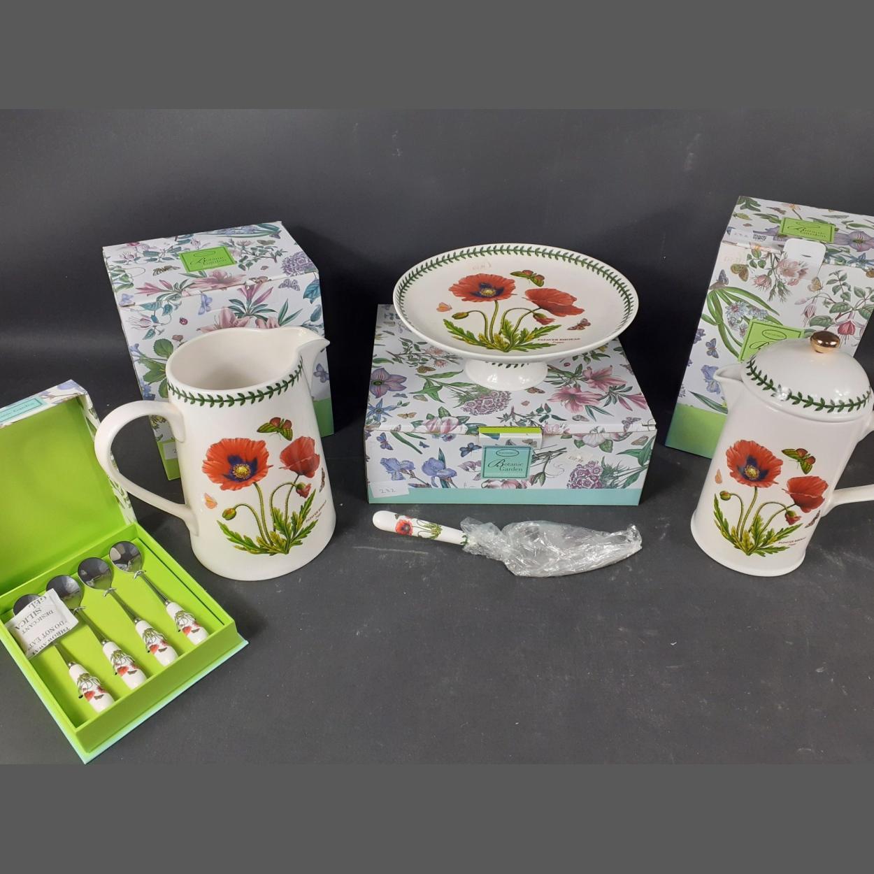 A selection of four boxed PORTMEIRION items consisting of a cafetiere, a jug, a cake stand with slice and a set of 4 teaspoons all in the Poppy design pattern - all unused condition
