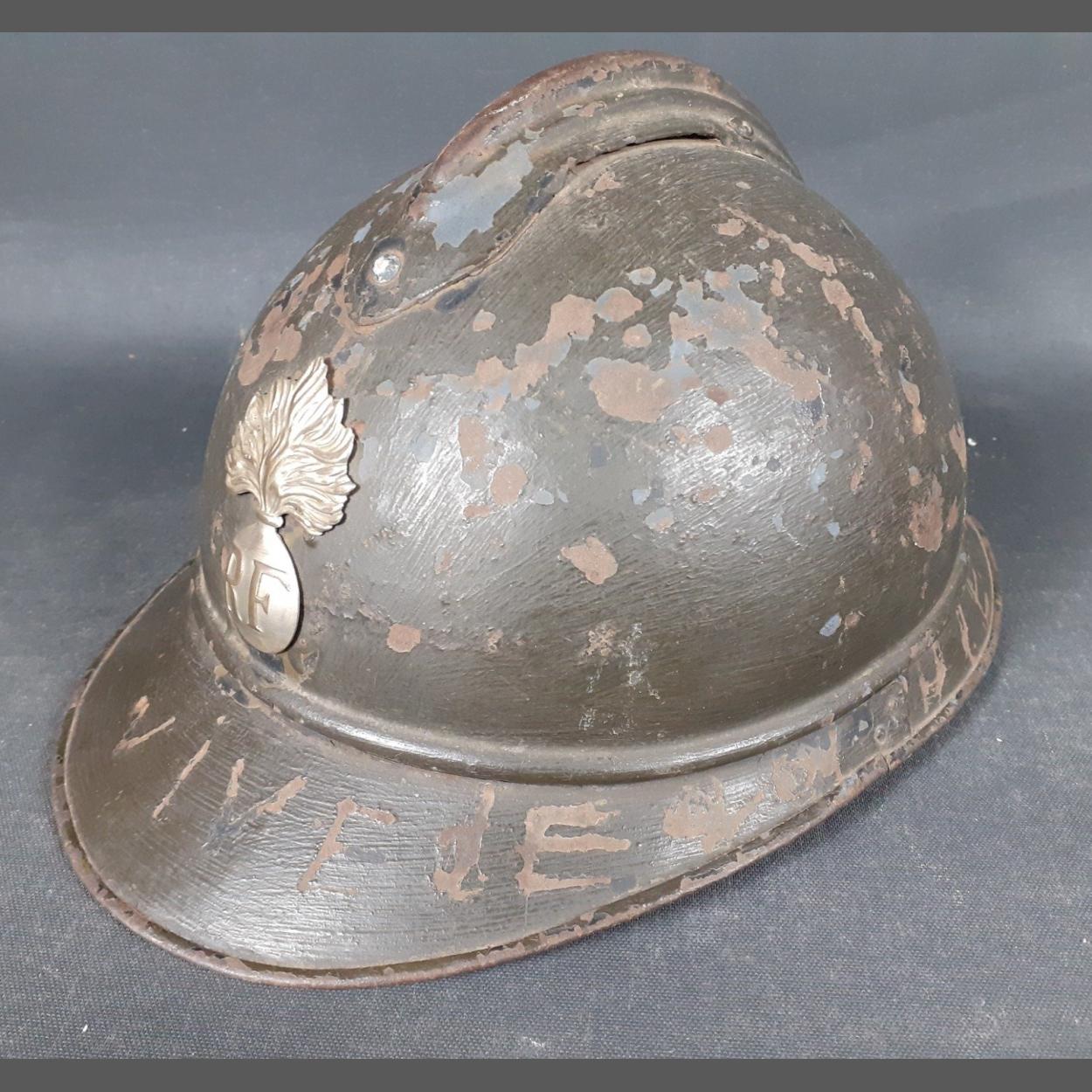WWI French Era ADRAIN steel helmet repurposed for WWII use by French Resistance / Free French. Scratched into the rim is VIVE DE GAULLE. No line, badge may be later addition. A rare and interesting helmet.