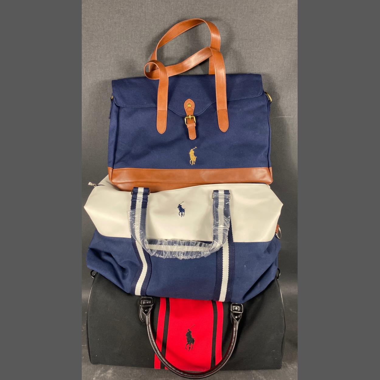A lot of three Polo Ralf Lauren bags (2 travel bags) 54cm long x 34cm tall and 50cm long x 35cm tall and a satchel/laptop bag, 42cm wide x 34cm tall approx as well as an Armani travel bag. Condition - All in good condition.