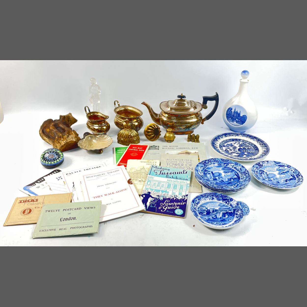 A mixed box to include a PERTHSHIRE MILLEFIORI Paperweight, a pack of 6 TUCK'S POST CARDS of the Military in London (post card no 5318) from the Tuck's Oilette Series in the original envelope, a set of 12 Valentine's postcard views of London in original envelope, a collection of various London theatre programmes from 1939, 2 London Transport maps of bus routes 1939, an EPNS tea service, a ROYAL COPENHAGEN Rosenborg Castle flagon (25cm high), 5 Copeland Spode plates, etc