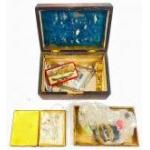 Five decorated wooden boxes of various sizes to include one used as a sewing box complete with haberdashery contents