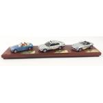 JAMES BOND - cars mounted on a wooden plinth to include from Die Another Day Aston Martin V12 Vanquish Jaguar XKR, a Goldfinger Rolls-Royce Phantom III with Oddjob figure and an Aston Martin DB5 complete with semi-ejected figure, a Goldeneye BMW Z3 Roadster, Tomorrow Never Dies BMW750il and The World is Not Enough BMW Z8 Roadster