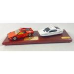 JAMES BOND - a wooden plinth with 2 iconic cars from the Spy Who Loved Me Lotus Esprit and From For Your Eyes Only the Lotus Esprit Turbo, plus BMW750iL from Tomorrow Never Dies,