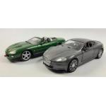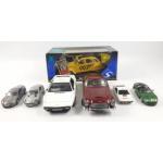 JAMES BOND Lotus Esprit signed by RICHARD KIEL (approx 24cm long), plus an Aston Martin DB5 complete with James Bond figure, a Jaguar XKR with figure, an Aston Martin V12 Vanquish, a 1/18 Aston Martin DB5 and a boxed 2CV (8051) Solido car (box faded and creased)