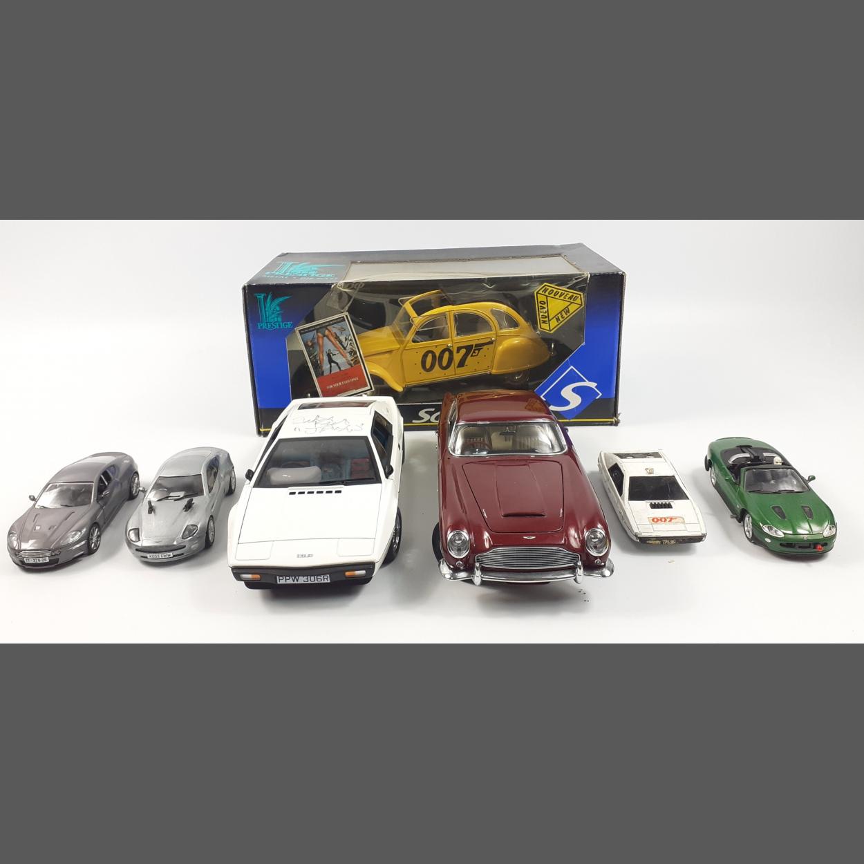 JAMES BOND Lotus Esprit signed by RICHARD KIEL (approx 24cm long), plus an Aston Martin DB5 complete with James Bond figure, a Jaguar XKR with figure, an Aston Martin V12 Vanquish, a 1/18 Aston Martin DB5 and a boxed 2CV (8051) Solido car (box faded and creased)