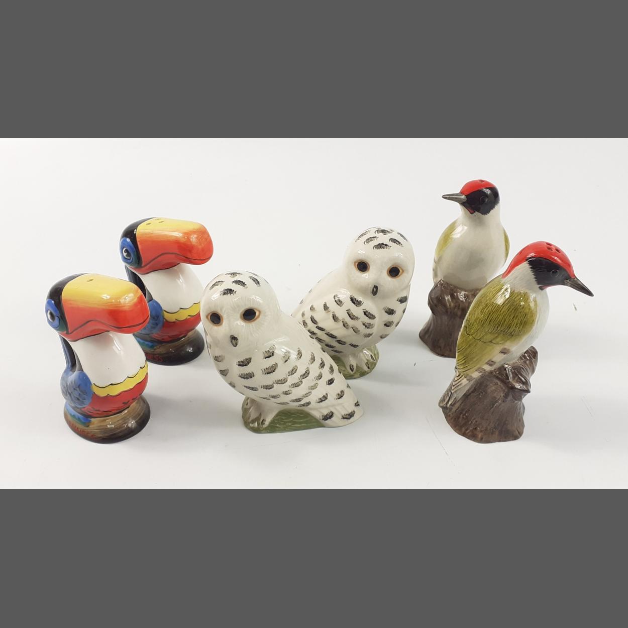 GUINNESS HERITAGE (G0075) toucan salt & pepper set, a QUAIL woodpecker salt & pepper set, and a pair of snowy owls salt & pepper set