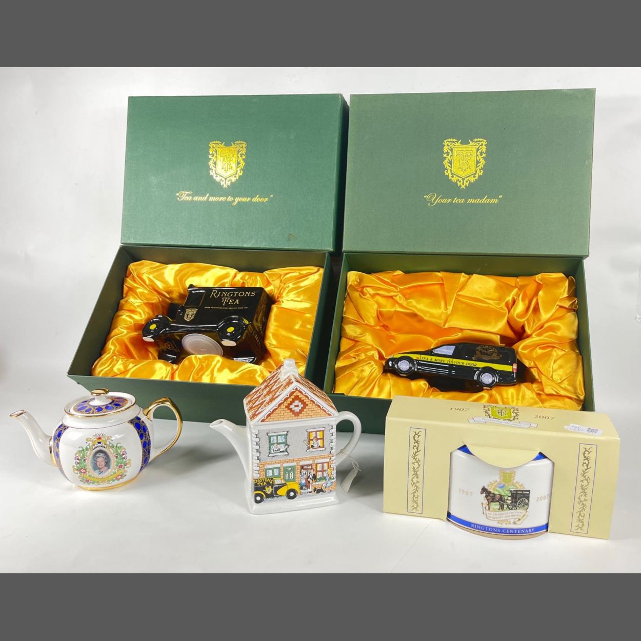 RINGTONS - A queen's golden jubilee TEAPOT, a 1960s collectors' teapot, a RINGTONs centenary teapot, a boxed, unused RINGTONS Austin K8 Van (AK011), a boxed Ford Escort van in Ringtons colours 20cm long, and a boxed Ringtons delivery van