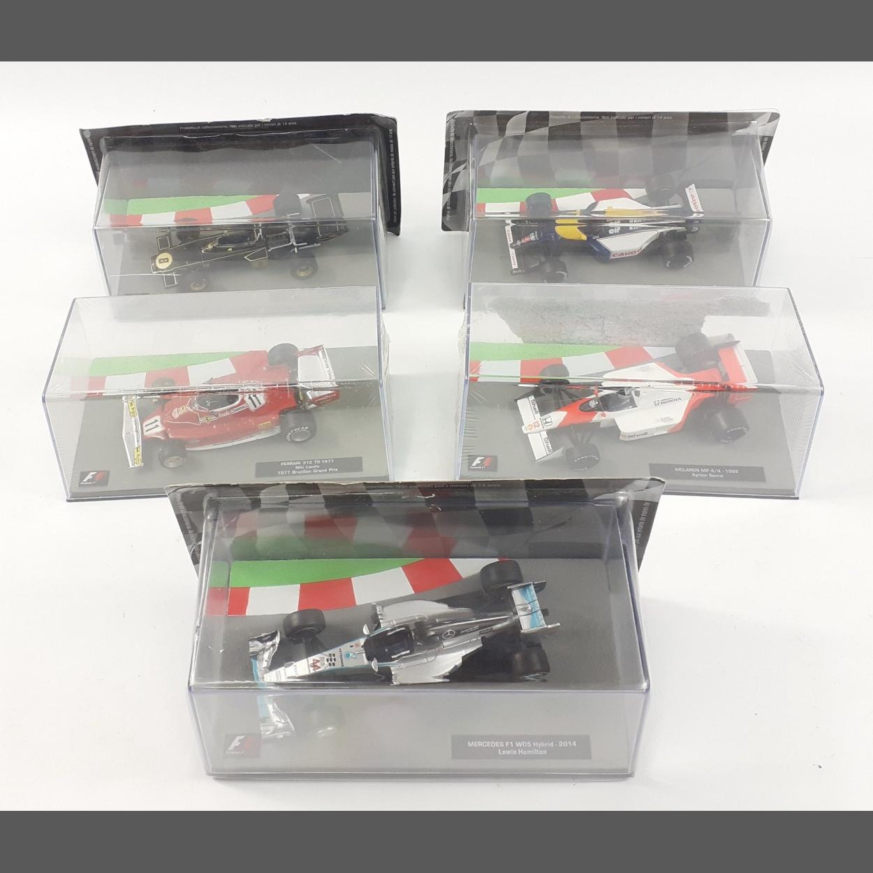 CENTAURIA F1 models. Superb detailed diecast models in original packing. Lot to include: Ayrton Senna McLaren MP4/4, Niki Lauda Ferrari 312, Emerson Fittipaldi Lotus 72D, Lewis Hamilton Mercedes F1, Nigel Mansell Williams FW14B.