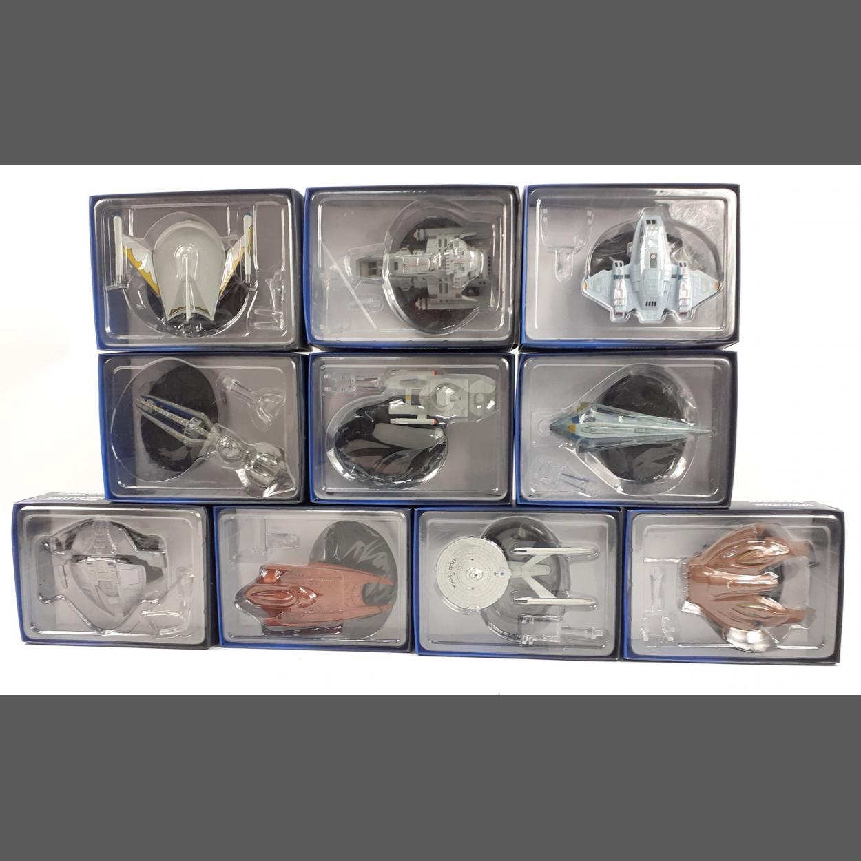 STAR TREK - a collection of blister packed, unopened EAGLEMOSS diecast figures to include USS Enterprise N-CC-1701-A (2804-A/A), Nausicaan Fighter (4102-A/C), Tholian Webspinner (2152) (3990-A/C), SS Antares (2000-A/A), Krenim Temporal Weapon Ship (1464-A/C), Danube Class Runabout (8928-A/B), Romulan Bird-of-Prey (2266) (8004-A/A), Vahklas (1006-A/A), USS Voyager Aeroshuttle (5764-A/A), JemHadar Fighter (7414-A/B)