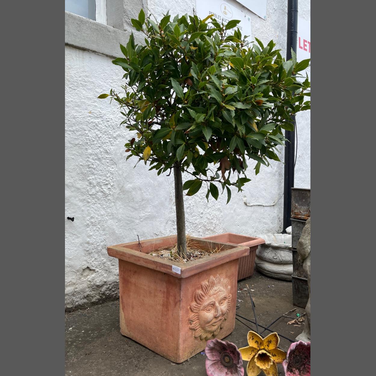 A TERRIFIC TERRACOTTA square planter with a sun effigy back and front - comes with Bay Tree planting - total height including the tree 110cm x 43cm square pot x 32cm height approx - starting bid from £50