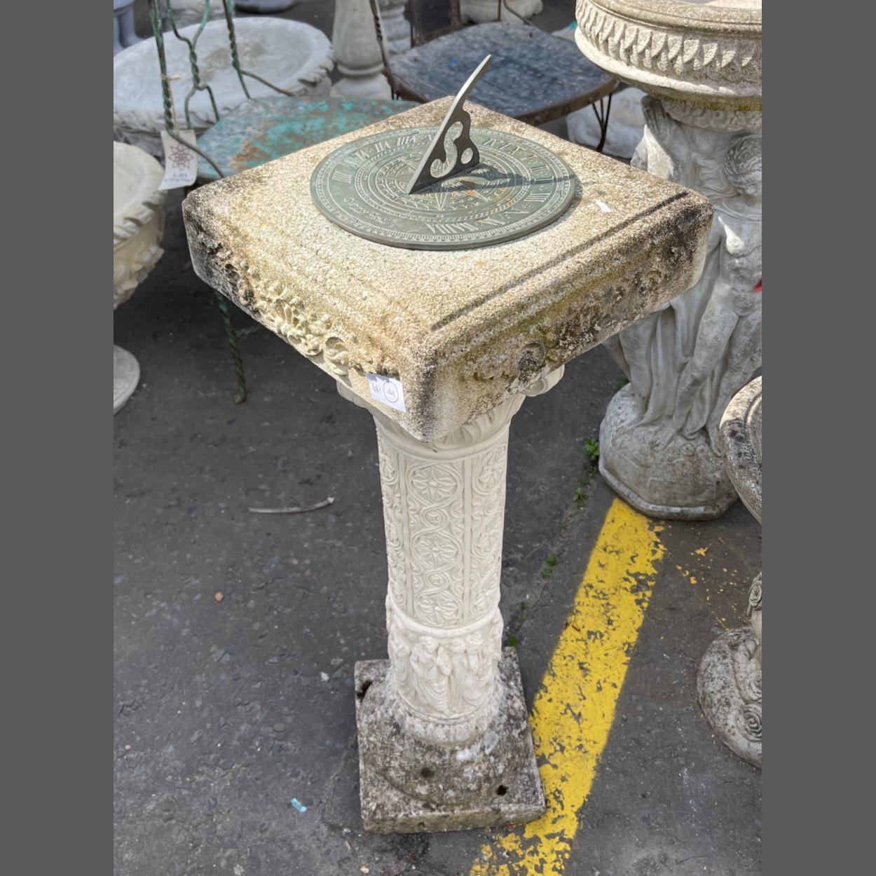 which turns- around / the sun dial part is brass verdigris - the column is beautifully carved - this is a top quality garden sun dial and would make a FABULOUS garden feature in any garden! - dimensions 3ft height x 11” square top approx - minimal starting bid £55