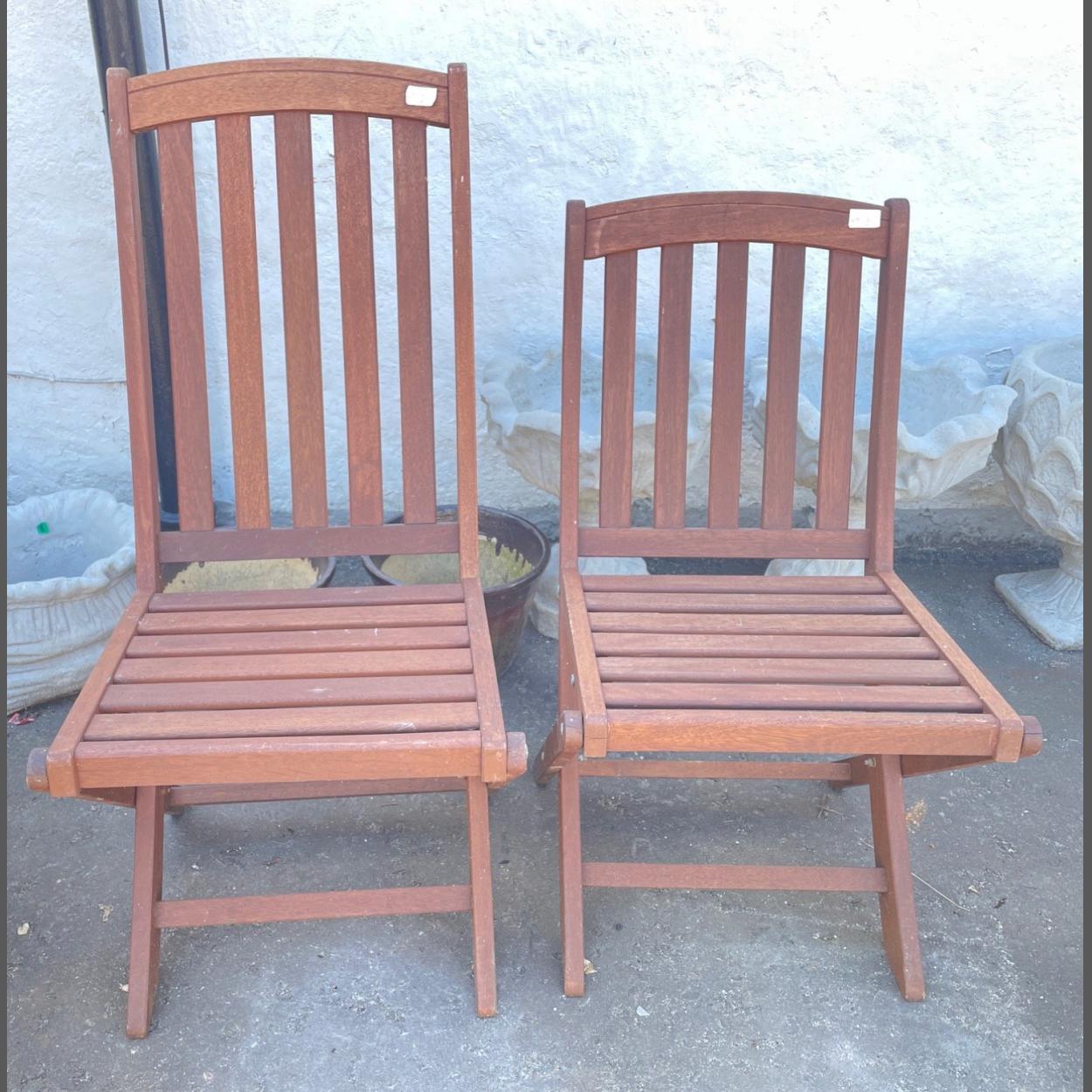 Two nice folding cedar-wood garden chairs - one with a slightly larger back to it - dimensions of the larger chair 1m tall - smaller chair 85cm tall approx - both in nice condition - handy chairs for entertaining.