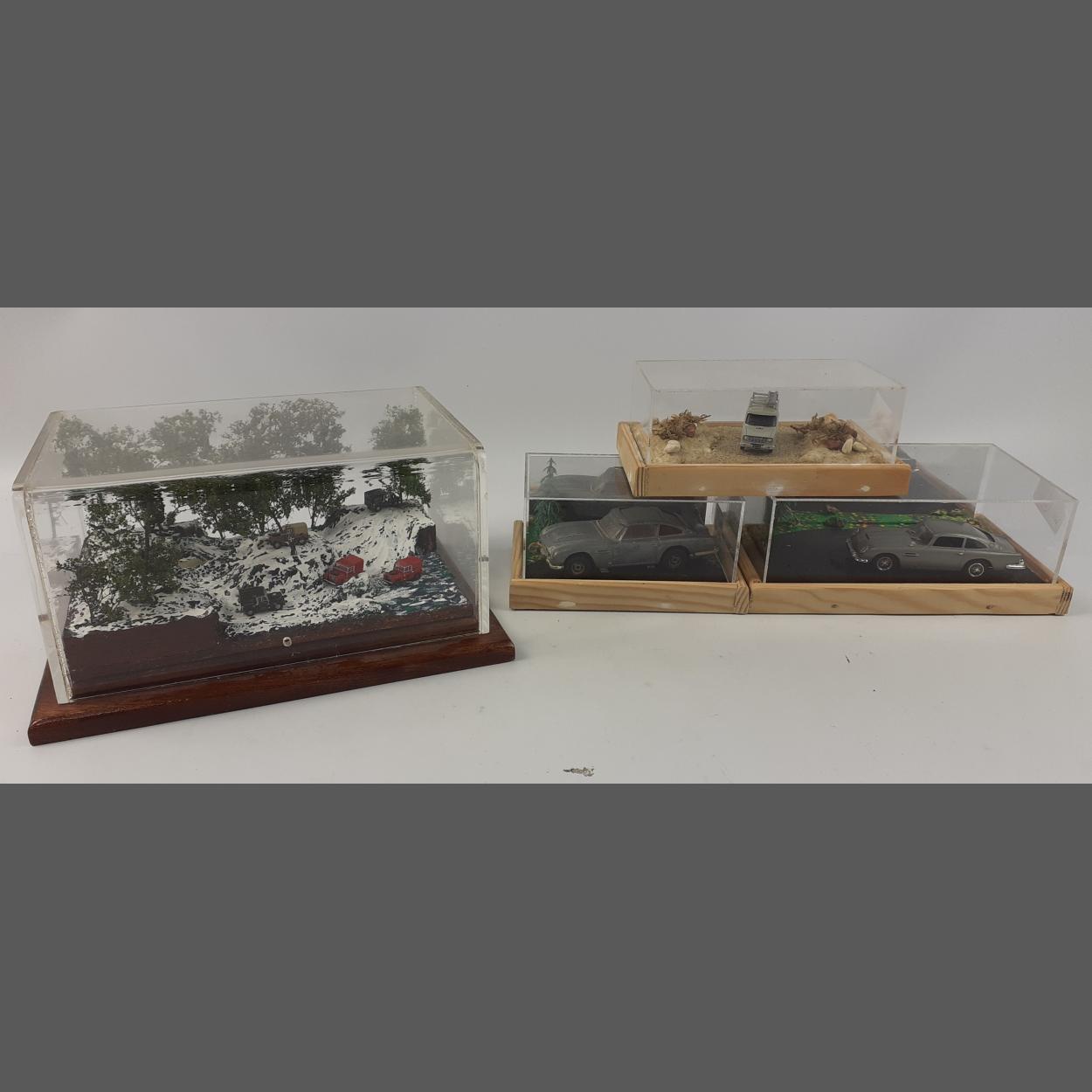 A collection of JAMES BOND Perspex boxed scenes from movies to include the DB5 etc - 4 models in total - these have been put together by the collector - dimension of largest scene (Landrover scene) 25cm x 19cm base x 13cm height approx
