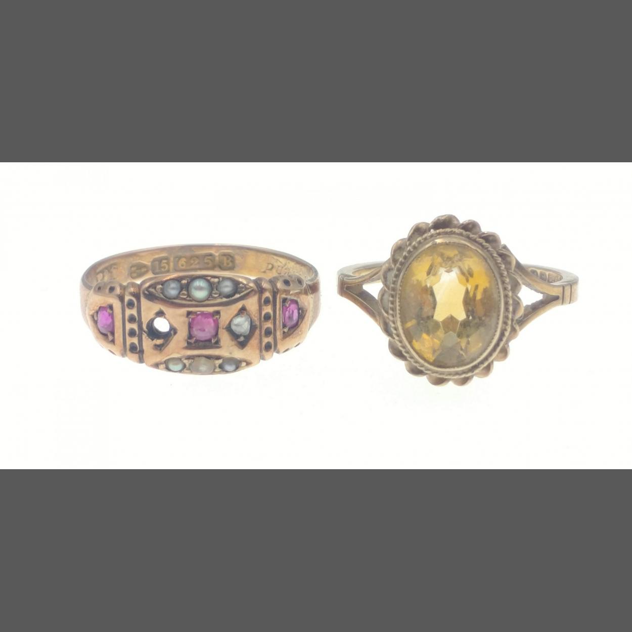 A 375 stamped yellow gold ring with citrine stone ring size K gross weight 2.24g with also a 9ct stamped garnet and tiny white stones with one diamond(tested) dress ring(one small diamond ring size O gross weight 1.64g approx missing)