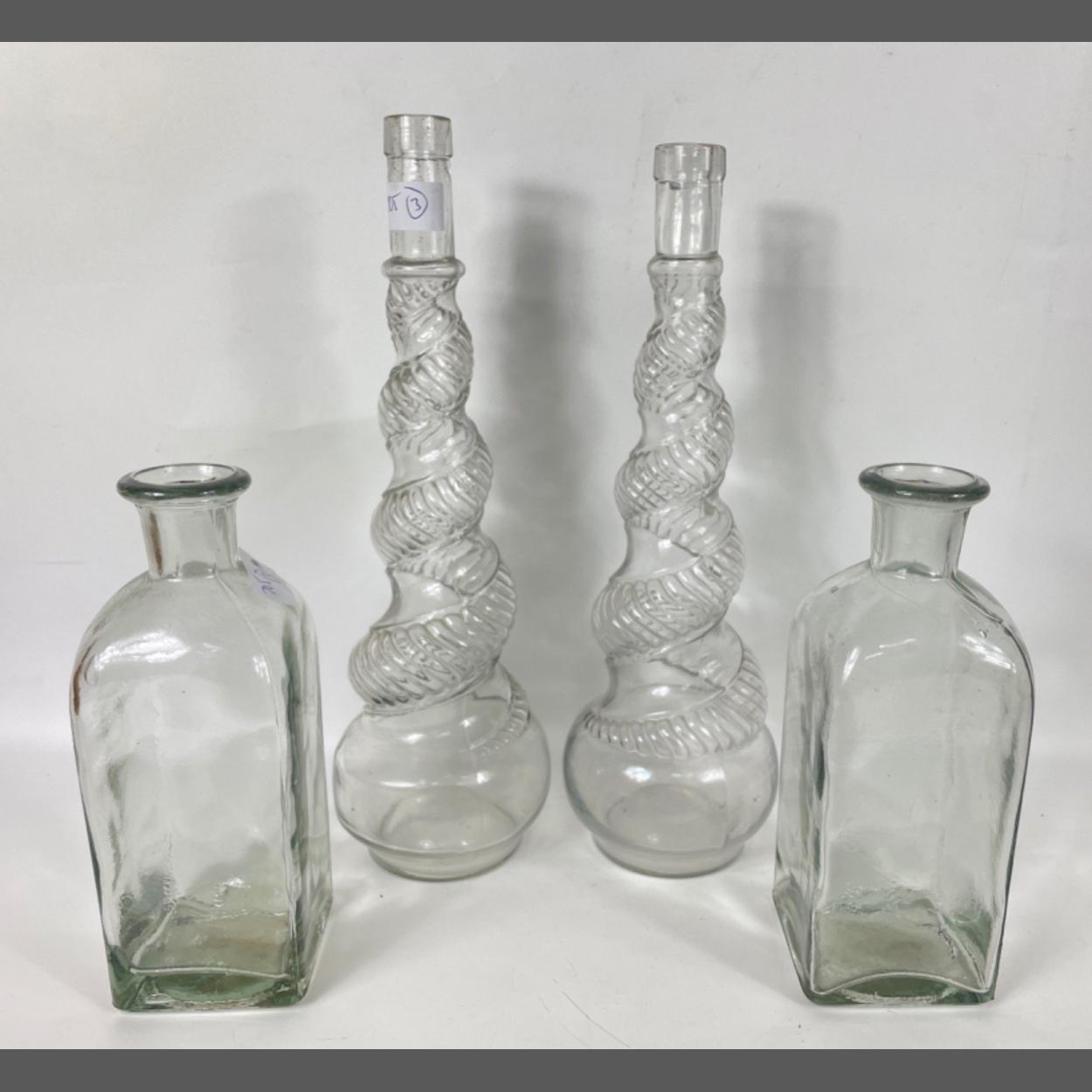 Four really old decorative bottles, two heavy bottomed traditional shaped bottles, and two VERY UNUSUAL twisted glass carafes c1950's height 38cm and the smaller two 24cm height approx