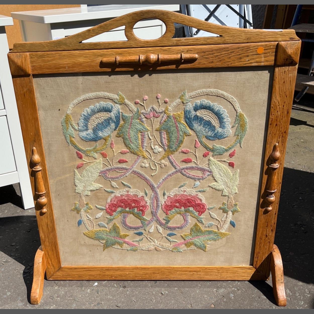 A vintage fire screen in a light oak frame with floral needle-work - dimensions 60cm x 63cm height approx